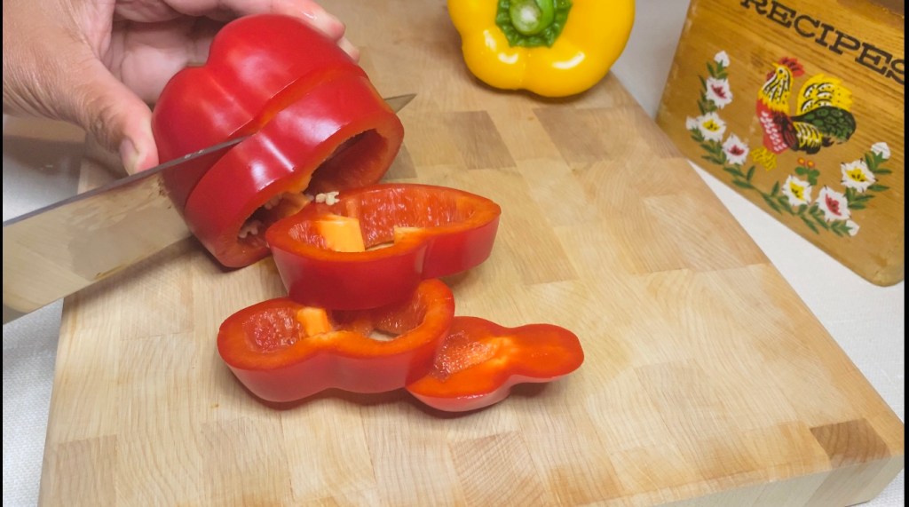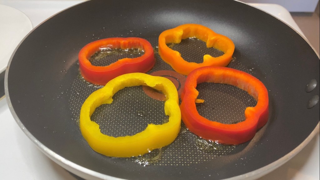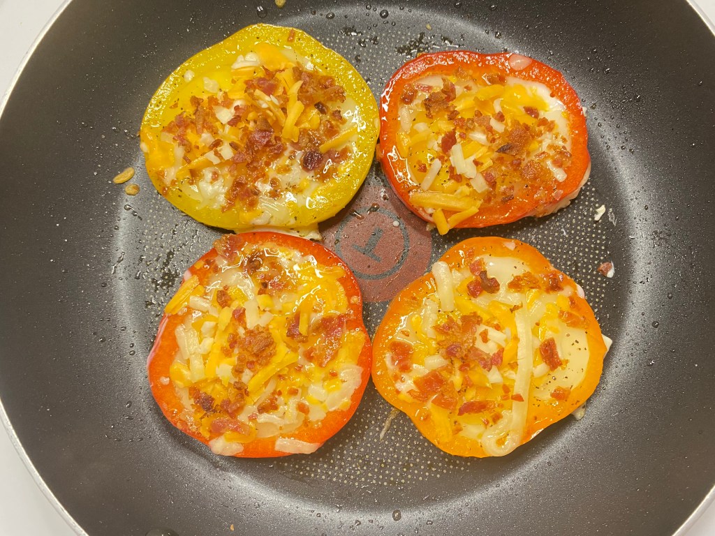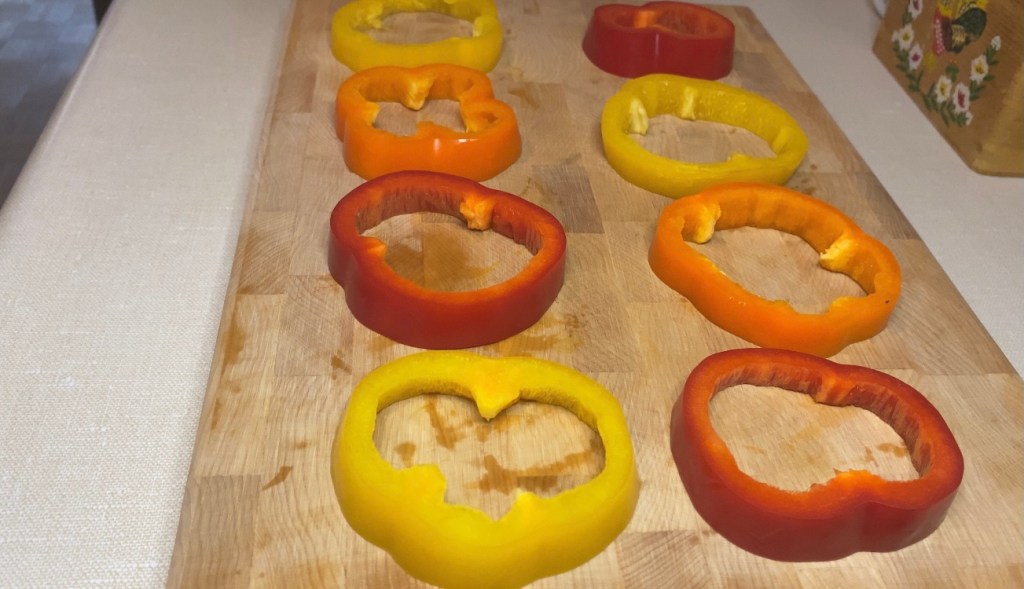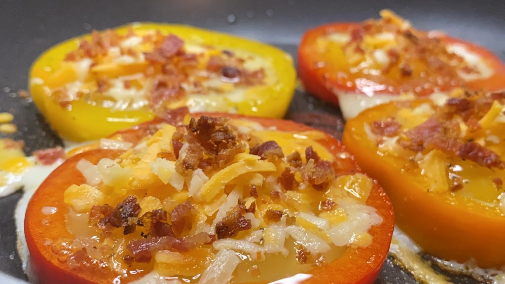 Having friends over for breakfast or brunch? Here’s a very creative recipe you could serve and to add to your breakfast menu. Cut those peppers in rings and fill them up with eggs, cheese and bacon. (Save the other parts of the pepper for stir fry, salad, soup or stew to limit food waste)